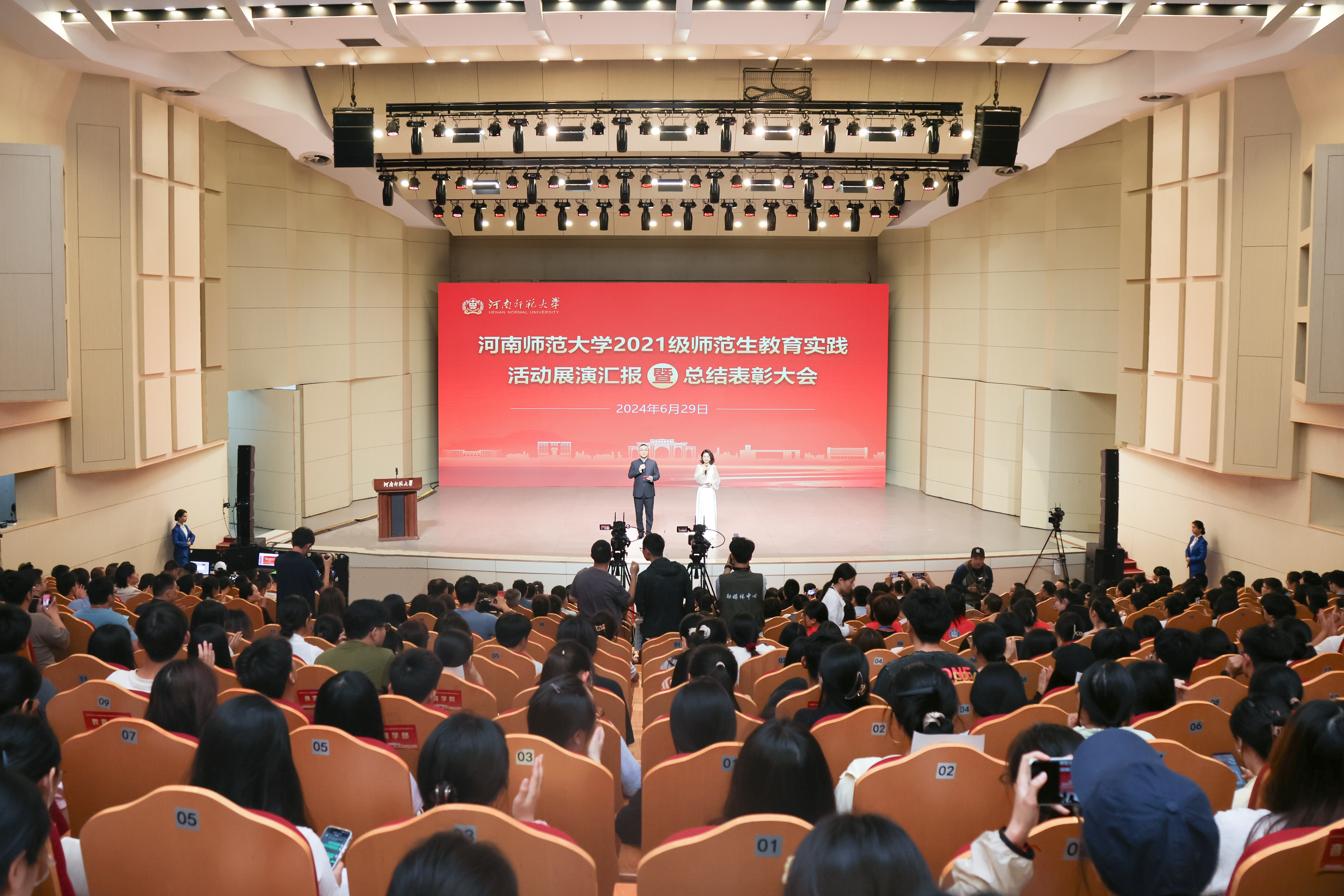 6月29日,我校召开“大力弘扬教育家精神,培养新时代卓越教师”2021级师范生教育实践活动展演汇报暨总结表彰大会,主会场设在帕瓦罗蒂音乐厅,各师范专业学院(部)设分会场。党委书记、校长冯淑霞,副校长宋晔,党委常委、副校长聂国兴出席会议,相关职能部门负责人,师范专业学院(部)负责人、专业负责人、教学秘书、教育实践指导教师代表,教育实践基地负责人代表、指导教师代表,相关用人单位,师范生代表等2000余人在线上线下参加会议。会议分为开幕式、教学技能大赛、演讲比赛、“面对面”座谈交流和总结表彰五个环节。