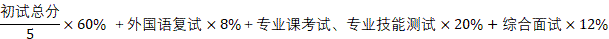 2. 专业学位复试成绩占总成绩的40%,其中外国语复试8%,专业课考试、专业技能测试20%,综合面试12%,总成绩计算公式为: