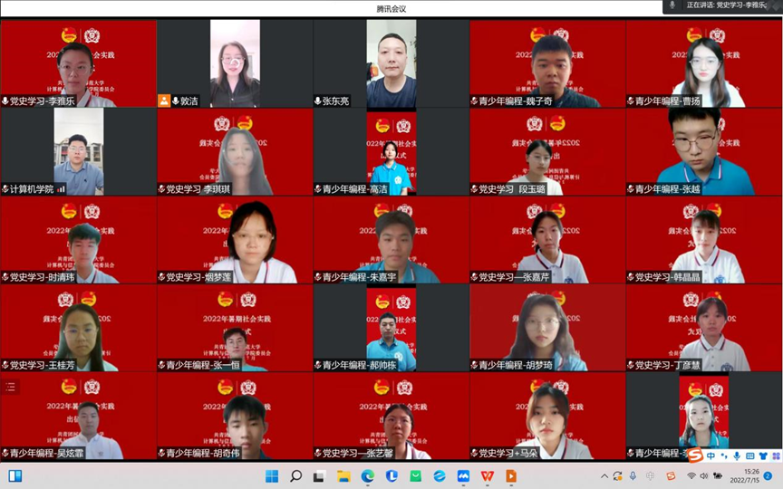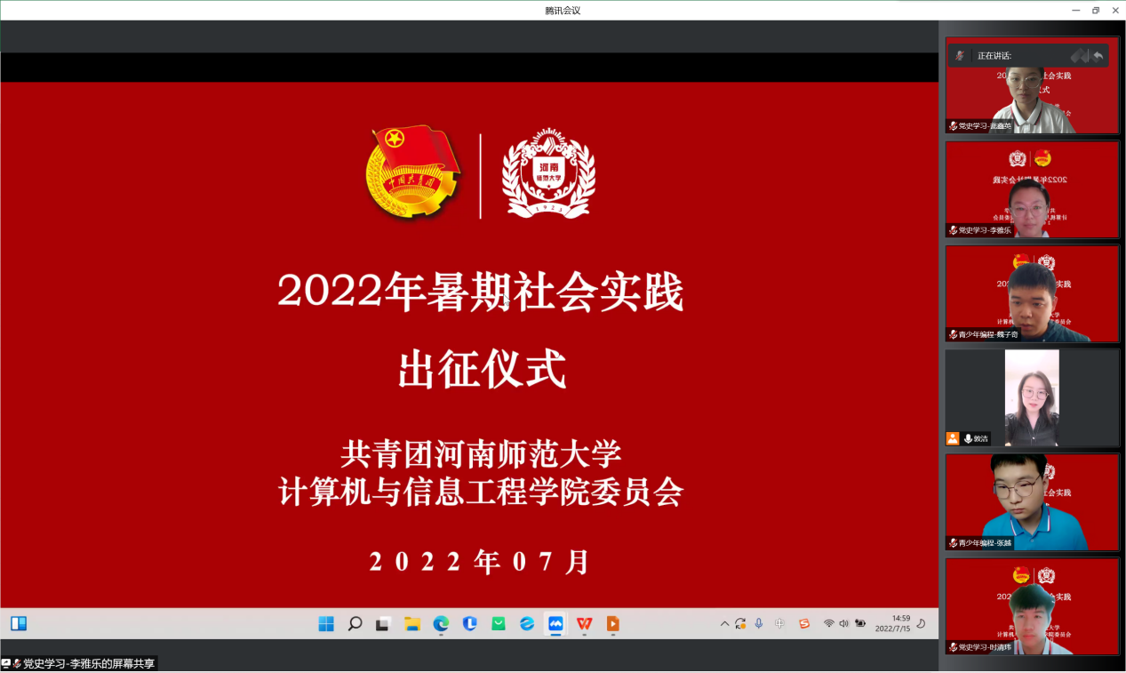 7月15日下午,我院在线上举行2022年暑期社会实践出征仪式,学院相关领导、暑期实践队指导老师及全体队员参加仪式。仪式由院团委副书记敦洁主持。