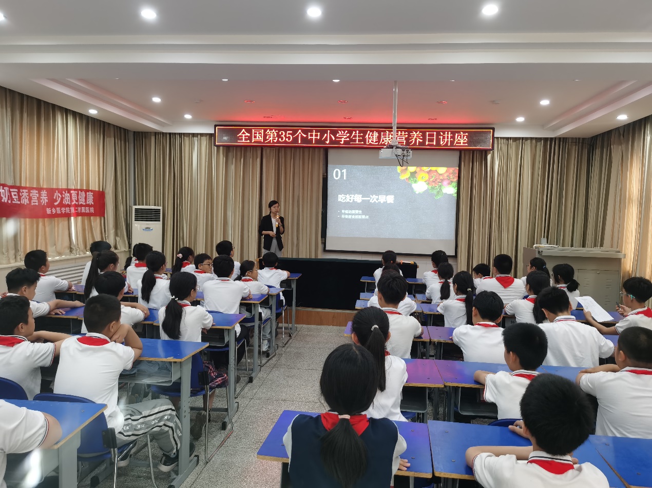 2024年5月20日是我国第35个“中国学生营养日”。今年的活动主题为:奶豆添营养,少油更健康。“健康中国,营养先行”均衡营养是一切生命和健康的基础,是利国利民的大计。为了广泛、深入宣传营养知识,校医院特别邀请由新乡医学院二附院健康营养师刘向群主治医师,为孩子们带来了一堂生动的《健康成长的秘诀》健康知识讲座。