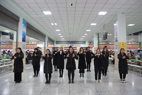 11月29日中午,青春健康快闪活动在万人餐厅内有序开展。《拥抱你》音乐一响起,20余名防艾宣传志愿者从人群中汇聚,随着音乐舞动,用无声的动作表达了对艾滋病患者的关怀,吸引学生驻足观看,现场气氛热烈。与此同时,艾滋病知识答题竞赛活动、“我想对你说”艾滋寄语活动正如火如荼的进行,过往学生积极参与知识竞答,写下自己对艾滋病患者的寄语。