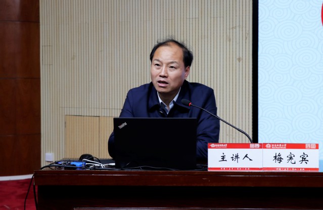 梅宪宾以“党史与党的理论创新”为题,从“我党历史上学习党史的第一个高峰”“深刻领会习近平新时代中国特色社会主义思想”“党史学习的启示与感悟”三个方面,系统阐述了不同历史阶段的党史研究对不同时期党的重要理论产生形成所具有的重大影响和内在联系,深入剖析了习近平新时代中国特色社会主义思想的理论依据和思想内涵,进一步诠释了开展党史学习教育的重要意义。他勉励在场师生要继承和学习革命先辈不屈不挠的革命精神和智慧,树立崇高理想,矢志艰苦奋斗。