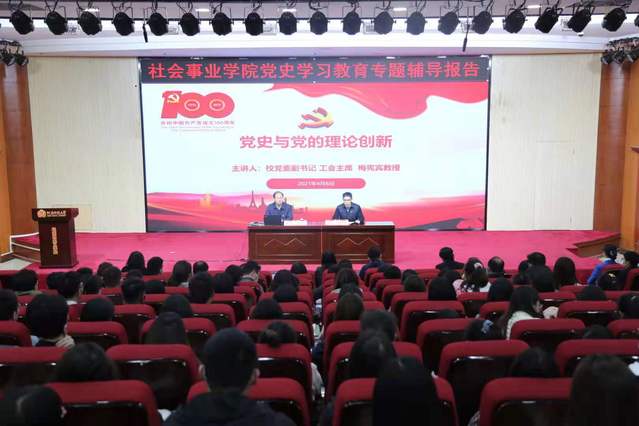 4月6日下午,校党委副书记、工会主席梅宪宾在思想政治理论课实践教学平台为社会事业学院师生作党史学习教育专题辅导报告。学院领导班子、政工干部、师生党员及入党积极分子代表近300人聆听讲授。