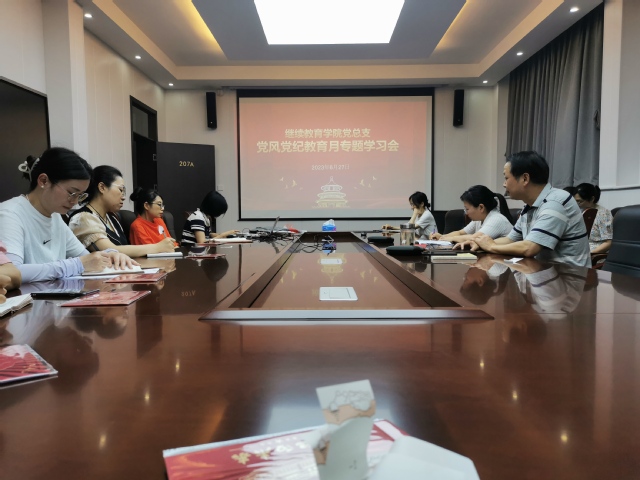 为深入学习贯彻党的二十大精神,扎实开展学习贯彻习近平新时代中国特色社会主义思想主题教育,增强党员干部廉洁自律意识,营造风清气正的政治生态,6月27日下午,继续教育学院党总支开展了强化党风廉政,筑牢廉洁自律防线 党风廉政教育专题学习活动。会议由党总支书记张喜平主持,学院全体党员参加会议。