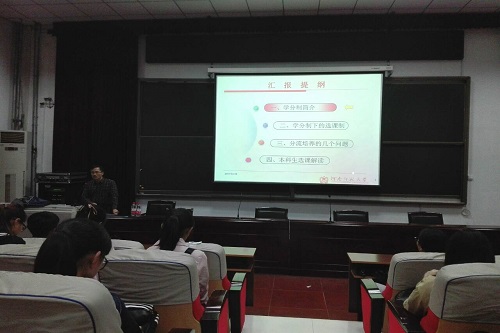 学,贵于思,慎于择。28日晚,副院长黄广月从“学分制”、“学分制下的选课制”、“分流培养”、“选课解读”四个方面展开讲说。首先,他通过对比来区分学分制与学年制,接着进一步剖析如何在修满学分的基础上更合理的选课。针对这一问题,他反复强调基础课程的重要性,切不可因为选修课影响专业成绩。随后,分流培养细则和推免暂行条例的讲解将整场活动推向高潮,现场气氛十分活跃。在会后的交流中,他鼓励学生认真、严肃地对待自己的专业课程,切勿自欺欺人。