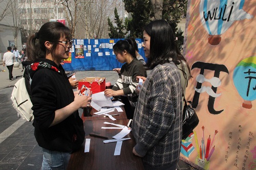 3月14日,数学与信息科学学院在西区万人餐厅主干道举行了国际数学文化节之“wuliπ节”活动,来自全校各学院百余名学生参与了此次活动。