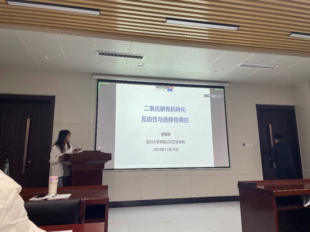 11月16日,四川大学华西公共卫生学院廖黎丽研究员应邀莅临我室,作了题为“二氧化碳有机转化反应性与选择性调控”的学术报告。报告会在实训楼0501报告厅进行,吸引了来自平原实验室、抗病毒性传染病创新药物全国重点实验室、化学化工学院的师生参加。