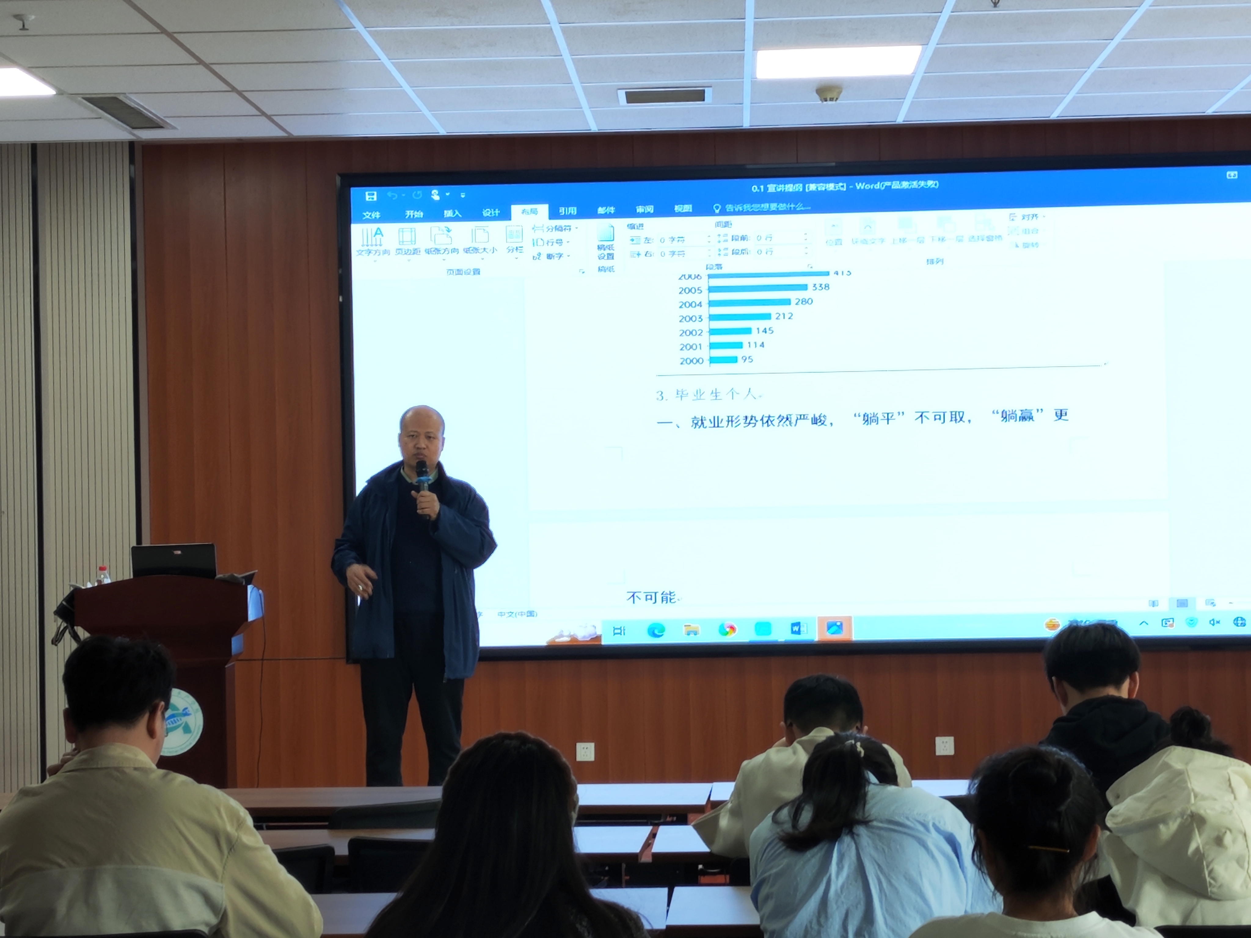 会上,马长浩首先从整体国际环境和大学生扩招两个方面,向同学们介绍了当前的就业发展形势和趋势,通过引用大量数据和实例,使同学们认识到当前就业形势的严峻性。他提醒毕业生应时刻关注就业市场变化,不断提升专业技能和综合素质,注重自身就业技能的培养、自我认识与评价和就业职位的选择等。他建议毕业生要全方面考虑就业岗位需求和自身能力价值的匹配度,结合兴趣和长远发展规划来确定就业目标。在最后互动环节,马长浩针对同学们在择业过程中的问题与困惑进行一一答疑解难,帮助学生进一步明确未来规划。