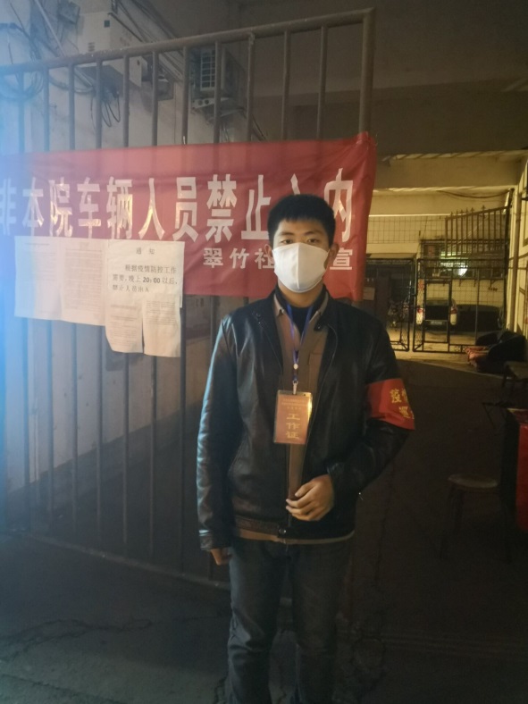抗击疫情走前线,勇担先锋做志愿。我是马克思主义学院2019级马克思主义理论类的一名学生。作为一名大学生,一名共青团员,我应该竭尽所能,贡献自己的绵薄之力,为赴战武汉的英雄们消除后顾之忧。我志愿参加了河南省平顶山市卫东区红鹰街道办事处的疫情防控工作,服务地点为翠竹社区,工作为每天晚上六点半与社区工作者对接,到十点钟结束,负责晚间社区控疫工作。主要工作任务是对进出车辆、人员进行排查登记、测量体温、宣传防疫知识、分发以及喷洒消毒液等。同舟共济渡难关,只要我们万众一心,一定可以打赢这场没有硝烟的战争!中国加油!武汉加油!