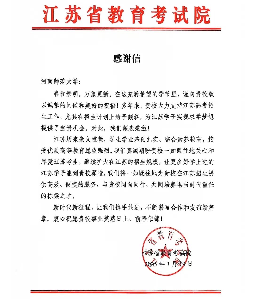 江苏省教育考试院在信中表示,多年来,河南师范大学在招生计划上对江苏学子给予大力倾斜,为无数江苏考生提供了接受优质高等教育的宝贵机会。信中特别提到,江苏历来崇文重教,学生学业基础扎实、综合素养突出,而我校的开放与支持,为这些学子铺就了追逐梦想的桥梁。