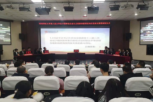 决赛在我校历届宗教知识竞赛的回顾视频中拉开帷幕。经过前期的网络竞赛、学院推荐与学校复赛的激烈角逐,最终有八个学院代表队成功晋级决赛。决赛赛制分为“百炼成金”“谁与争锋”“涅槃重生”三个环节。决赛场上,各代表队成员凭借着丰厚的知识储备与敏捷的反应能力,冷静沉稳地进行答题,精彩的现场表现获得了观众的阵阵掌声。比赛期间,现场观众积极参与到答题互动环节,现场互动热情高,气氛高涨。