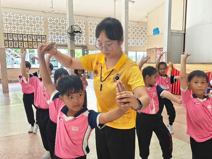 在“品中国书法之美”活动中,志愿者教师王琰向学生们简要介绍了中国书法的基本知识,选取与泰文书写规律相似的小篆书体,示范了“得闲饮茶”四字的写法,并指导学生动手尝试书写汉字。在“习中华武术之妙”活动中,志愿者教师贺宁馨为学生们展示了太极拳、少林拳等中国传统武术的表演,并详细地讲解了中国传统武术的基本功和招式,学生们学习了一些简单的武术动作,体验到了中华武术的力量与美感。