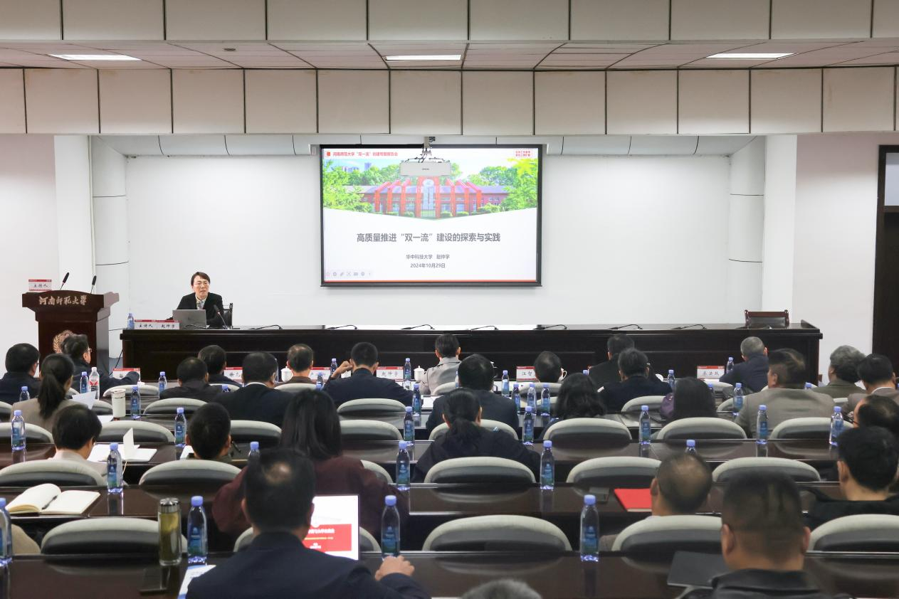 10月29日上午,2024年“双一流”创建专题报告会在勤政楼第四会议室召开。华中科技大学发展规划与学科建设处原处长赵仲宇教授,国家杰出青年科学基金获得者、中国科学技术大学卢建新教授,青年长江学者、中国科学技术大学徐允河教授受邀参会。党委书记、校长冯淑霞,副校长江智勇、杨亚东、秦法跃、苗雨出席会议。“双一流”创建工作领导小组成员,教学单位院(部)长,分管副院(部)长,“双一流”创建学科、省级特色骨干学科、省重点学科带头人,学科秘书参加会议。会议由苗雨主持。