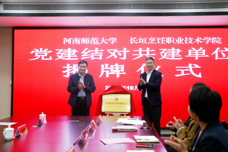 欧阳豫樊对河南师范大学领导、老师的到来表示热烈欢迎,他介绍了长垣烹饪职业技术学院的基本情况,表示要以结对共建为契机,相互借鉴,共同推动党建工作创新发展;相互学习,共同推动党建事业融合提升;努力探索,共同推动结对共建走深走实。随后,双方共同为“党建结对共建单位”揭牌。