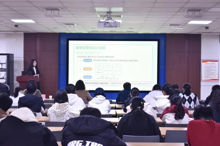 本次比赛以说课形式进行,由说课展示与答辩两个环节构成。比赛过程中,选手们充分展现了自身的教学风采和对教学的深入思考与设计能力。其中,化学专业刘慧琳以乙醛为课题,巧妙地通过列举生活中的事例以及顺口溜等生动情景引入课程,从学情分析、教学与评价目标、教学过程、设计意图等七个方面进行说课展示,严谨又富有趣味性。评委们从语言表达、内容深度、板书设计等多个维度对选手进行了全面而细致的评审,刘玉荣对每位选手进行了细致点评,提出了宝贵的指导建议,期望同学们进一步强化课程逻辑,更加完整且清晰地呈现教材的课程体系,不断提升自己的教育教学技能和素养。