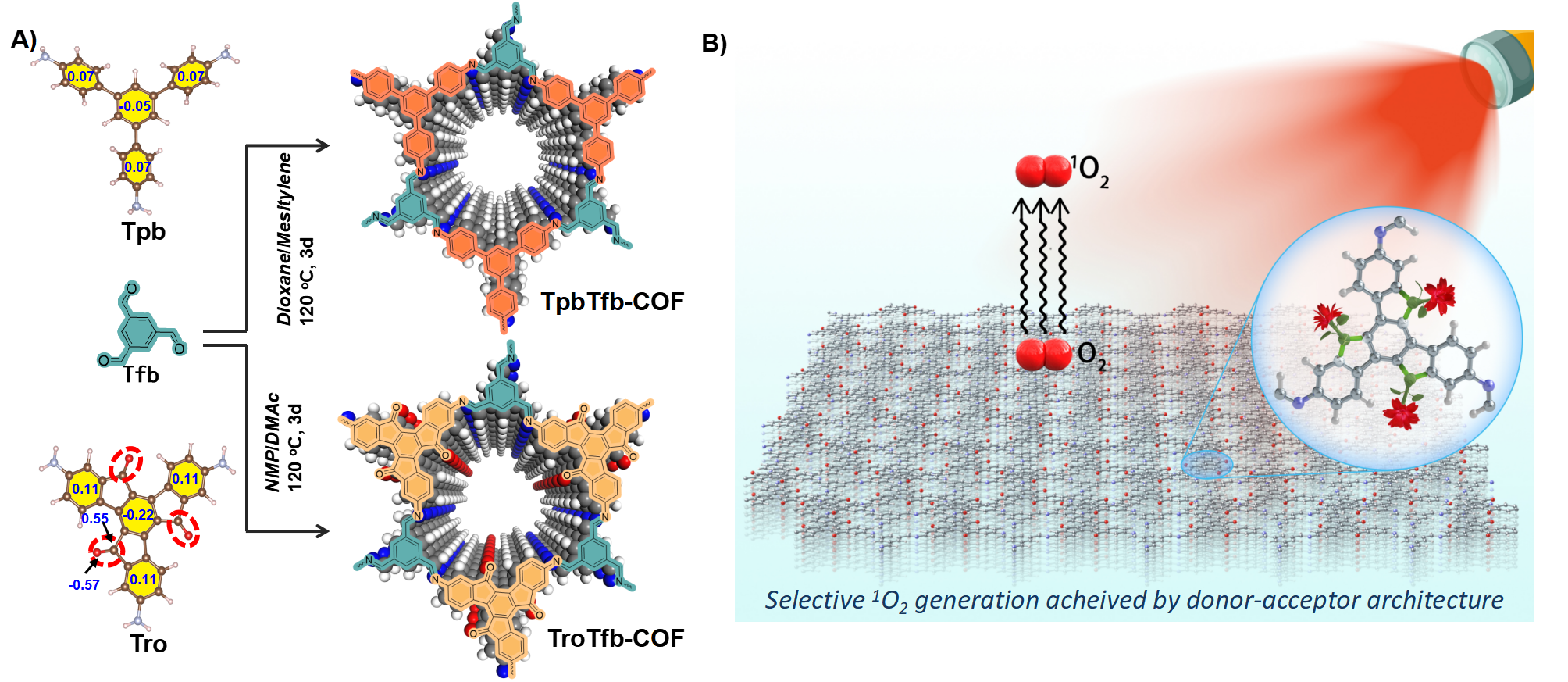 活性氧物种在环境修复、有机合成、能源转化等领域有着广泛应用,尤其是具有独特电子构型与选择性反应活性的单线态氧(1O2)在氧化反应中占据重要地位。然而,目前主流的1O2光催化体系大多依赖蓝光或高强度光源激发,从而引起一系列问题,例如光穿透性差、能耗高、副反应多等,严重限制了其穿透反应能力和规模化应用。为此,该研究团队提出了一种基于供体-受体(D-A)策略的新型共价有机框架材料(TroTfb-COF),通过引入羰基官能团,成功实现了电子的局域化调控,从而在红光照射下实现了高效、选择性地产生1O2。研究结果证实,通过在1,3,5-三苯基苯(Tpb)核心结构的两个相邻苯环上合理引入吸电子的羰基基团,所得TroTfb-COF 显著增强了框架内部的D-A相互作用。这一分子设计不仅促进了电荷在框架内的局域化,而且通过形成共平面“锁定”构型增强了层间的 π-π 堆积作用。因此,TroTfb-COF 在 200-750 nm 范围内表现出比纯碳骨架模型 TpbTfb-COF 更强的可见光吸收能力,展示出作为红光驱动光催化剂的应用潜力。在红光照射下,TroTfb-COF 通过耦合电荷转移机制选择性地产生1O2,其光催化活性相比TpbTfb-COF 提高了10倍,首次实现了在高级氧化反应中目标产物的高效选择性合成。这一成果揭示了新型共价有机框架材料的结构-性能关系,拓展了该材料在克级合成、穿透催化以及环境污染物降解等方面的应用范围,为低能光催化新材料的设计提供了新的思路。