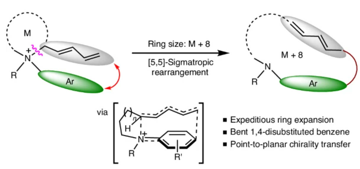 对环蕃骨架作为一类具有1,4-二取代苯框架的特殊大环化合物,广泛存在于万古霉素(抗生素的“最后一道防线”)等天然产物和生物活性分子中。然而,传统闭环合成策略在构建高张力对环蕃时面临严峻挑战:高稀释条件需求、易发生分子间二聚或聚合副反应,且难以精确控制环张力等。针对这些诸多挑战,陈豪华副研究与李杨教授合作开发了一种通过N-芳基化-环扩张[5,5]-σ重排反应高效合成高张力对环蕃的新策略。利用环状叔胺与苯炔中间体的协同反应,一步实现八原子环扩张,成功构建了具有显著角度畸变的1,4-二取代苯环单元。该环扩张重排策略突破了传统合成高张力对环蕃的瓶颈,为构建复杂药物三维分子提供了高效平台。