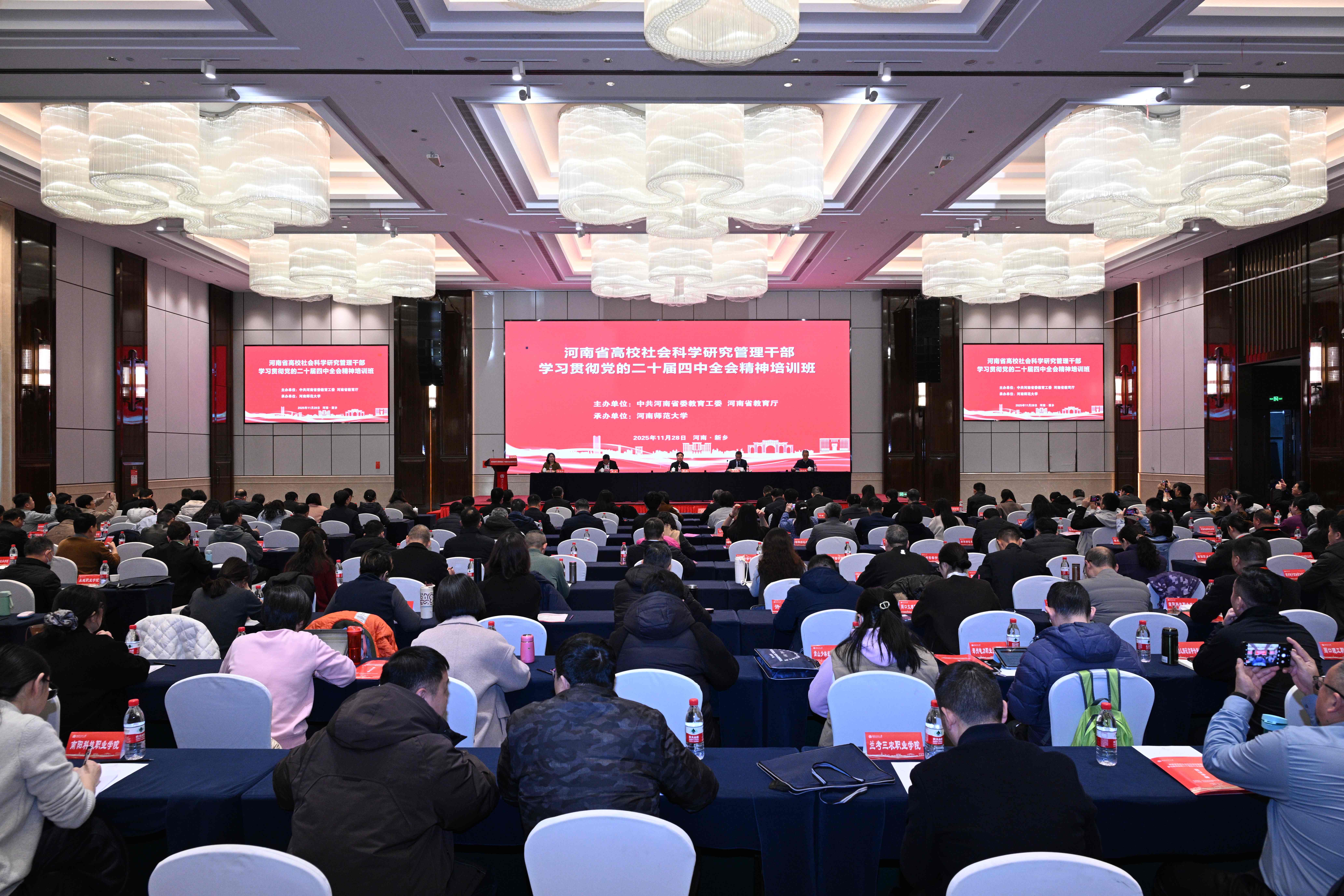 为深入学习宣传贯彻党的二十届四中全会精神,加强全省高校社会科学研究管理工作,交流管理工作经验和有益做法,提升社会科学研究质量和水平,11月28日,由中共河南省委教育工委、河南省教育厅主办,河南师范大学承办的河南省高校社会科学研究管理干部学习贯彻党的二十届四中全会精神培训班在新乡举办。省教育厅党组成员、副厅长、一级巡视员吕冰出席会议并致开幕词,我校党委副书记秦法跃出席会议并致欢迎辞,省教育厅二级巡视员、社语处处长韩冰主持开班仪式。全省本科高校主管哲学社会科学工作的学校领导、全省高校哲学社会科学管理服务部门负责人共计180余人参加培训。