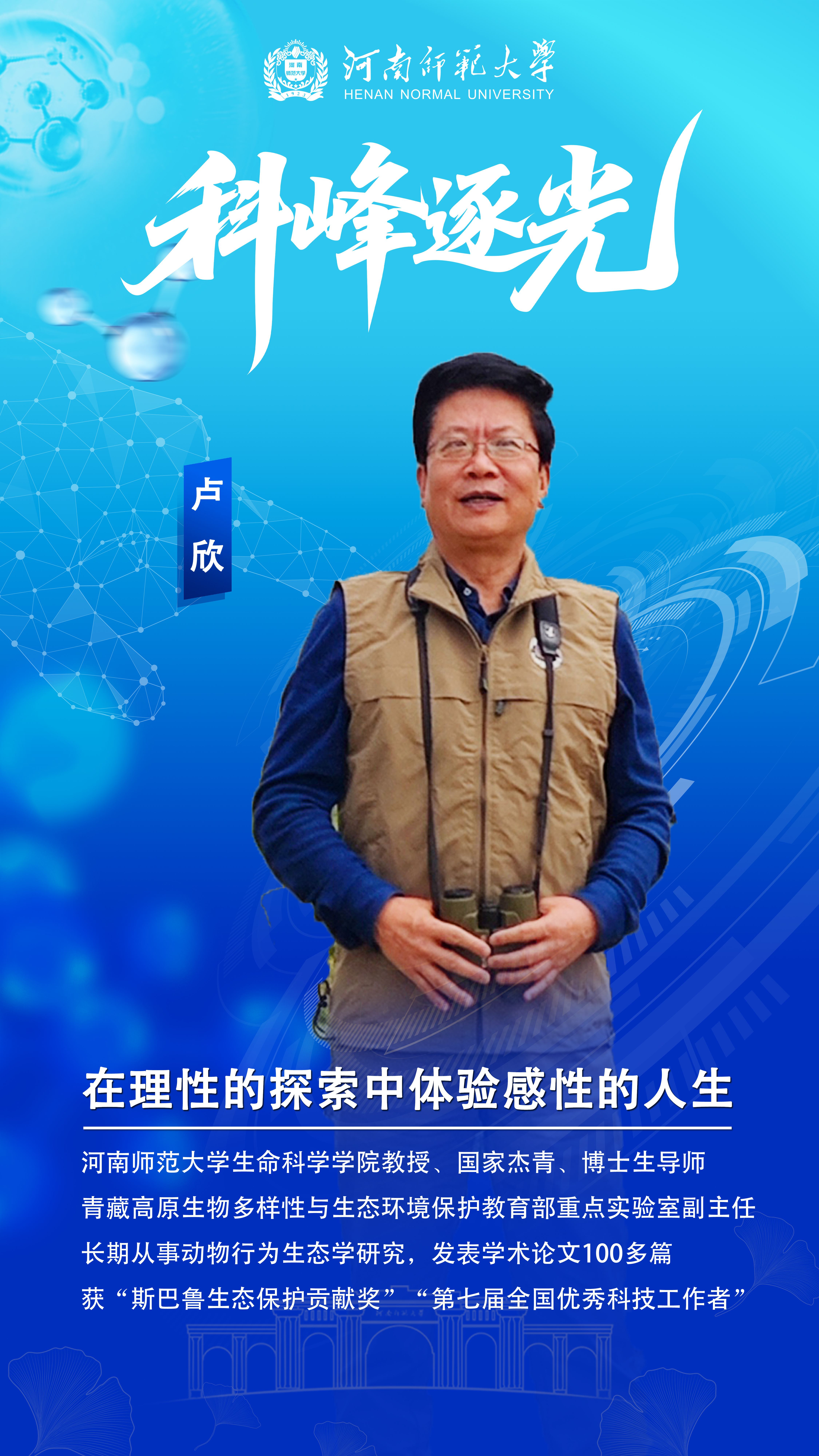 卢欣教授简介:河南师范大学生命科学学院教授,博士生导师,国家杰出青年科学基金获得者。长期从事动物行为生态学研究,发表学术论文100多篇,主编学术专著和教材多部。曾任中国动物学会鸟类学分会副理事长,现任青藏高原生物多样性与生态环境保护教育部重点实验室副主任。获“斯巴鲁生态保护贡献奖”,“第七届全国优秀科技工作者”。