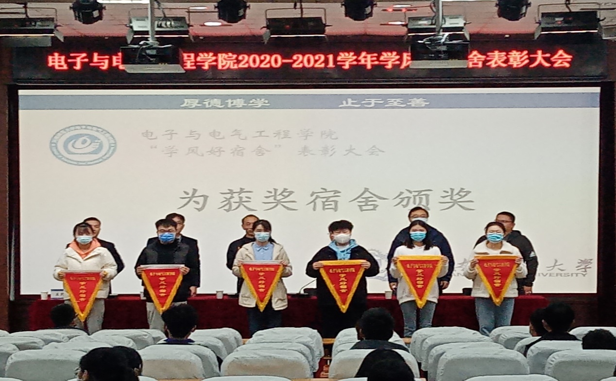 本次大会在庄严的国歌声中拉开序幕。随后,王芳宣读了《关于表彰2020—2021学年学院“学风好宿舍”的决定》,学院领导集体为各年级26个“学风好宿舍”代表颁发荣誉锦旗,并合影留念。