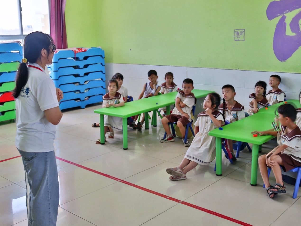 “节能环保,变废为宝”,实践队队员通过演示“自动定量补水器实验”、“虹吸实验”宣传节能环保、废物回收理念,教授孩子们利用废弃物品做成自主补水的简易生活装置。