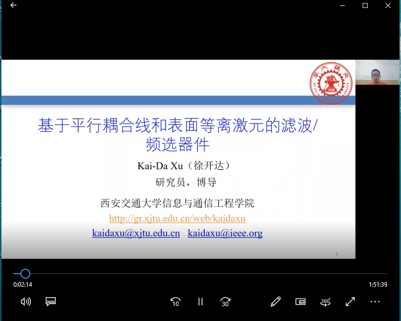 应我院邀请,西安交通大学徐开达研究员(博导)于9月18日上午9点在腾讯会议平台上作了题为《基于平行耦合线和表面等离激元的滤波频选器件》的专题学术讲座。学院负责人、师生代表100余人参加讲座。讲座由科研副院长王芳主持。