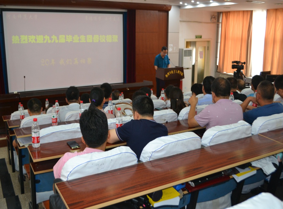 院长杨宗献表示对99届同学毕业二十周年聚会表示衷心的祝贺,对参加聚会的同学表达热烈的欢迎。随后向校友们介绍了学院发展情况,学科特色,教学、科研项目和成果等方面的情况,对校友们多年来对母校及母院的关注和支持表示衷心感谢。最后希望各位校友在新乡开心愉快,祝校友们工作顺利,身体健康。