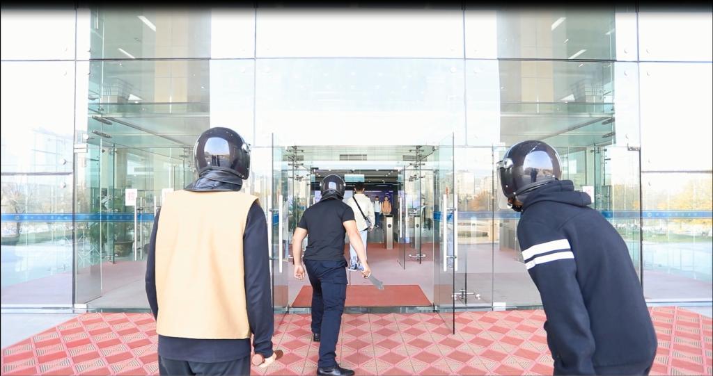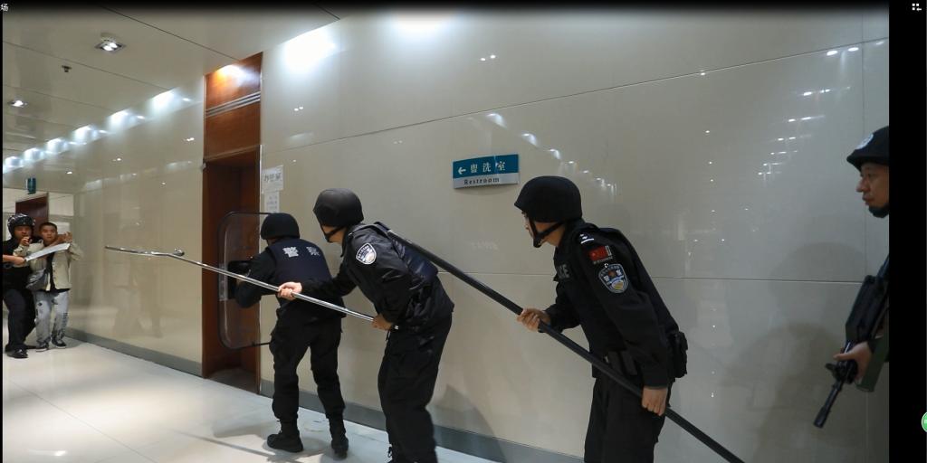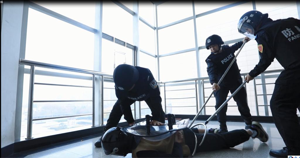 本次演练围绕着四名“歹徒”强行闯入校园,实施“砍杀”、“劫持人质”、“纵火”等“暴力行为”。在“施暴”初期,学校第一时间启动应急预案,派出校警巡逻组队员,冲锋陷阵,他们通过手持钢叉、盾牌、棍棒等将“歹徒”围住,采取灵活、机动的战术成功制服一名“歹徒”;与此同时,保卫处向110指挥中心报告,并紧急疏散人群,防止师生受到伤害。随后,在与110指挥中心派出的特警队以及相关单位的通力合作下,成功抓获所有“歹徒”,并扑灭“火势”,营救出“被困人员”。