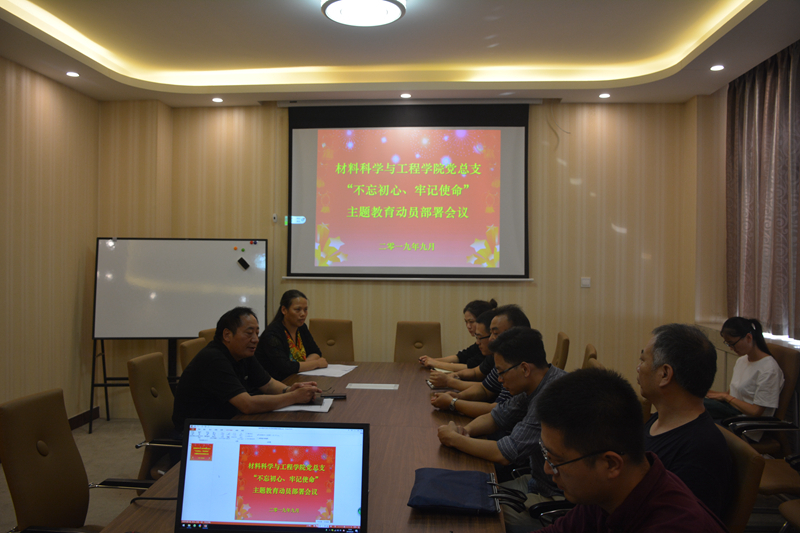 院长高书燕传达了学校“不忘初心、牢记使命”主题教育动员会精神,领学了《材料科学与工程学院党总支“不忘初心、牢记使命”主题教育实施方案》,并结合学院学科建设、人才队伍建设、制度文化建设等工作开展对学院主题教育活动进行了安排部署。