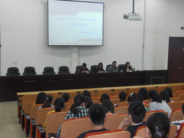 4月15日晚,计算机与信息技术学院、软件学院在计算机楼217报告厅举办考研经验交流会,2008级学生代表姜晓、李志欣、李欢、李俊科应邀介绍经验,2009级200余名学生积极参加了本次交流会。