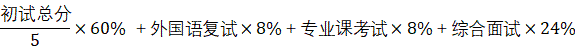 1. 学术学位复试成绩占总成绩的40%,其中外国语复试8%,专业课考试8%,综合面试24%,总成绩计算公式为:
