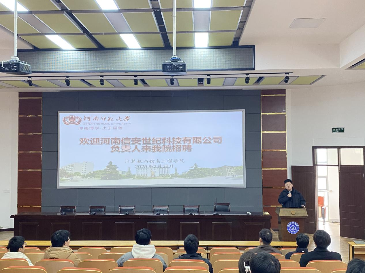 为精准对接行业前沿需求,拓宽学生就业渠道,2月28日我院邀请云南联合视觉科技有限公司与河南信安世纪科技有限公司到学院举办专场招聘宣讲会。本科生毕业班辅导员魏继拓、企业相关负责人以及70余名本科生和硕士研究生参加招聘会。