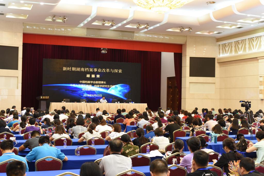 在学术报告阶段,胡振荣局长作了“新时代湖南省档案事业改革与探索”的学术报告,介绍了湖南省档案工作近年改革思路和具体做法,强调了档案专业人才对事业发展的重要性,希望中南高校档案人员在档案工作创新和专业技术人才培养中发挥更大作用。南京大学信息资源管理学院副院长吴建华、中国人民大学信息资源管理学院党委副书记徐拥军、浙江立芯科技股份有限公司副总经理马鸣、湖南德立信软件开发有限公司董事长付文韬、武汉大学档案馆馆长涂上飙先后围绕档案工作发展、档案基础理论、RFID智慧档案馆建设、档案数据化、高校档案文化等主题作学术报告。湖南科技大学档案馆馆长、省高档会副理事长陈飞主持学术报告会。