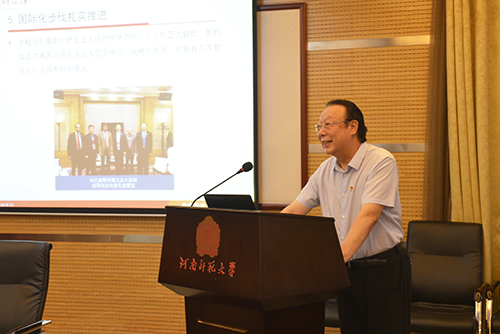 赵国祥以“文明创建硕果盈枝、立德树人华章溢彩”为题汇报了我校全国文明校园创建的情况。他指出,我校按照“六个围绕、六个构建”的整体思路,凝聚了“一训三风”的精神文化内涵,构建了文明创建的“六大体系”。学校围绕立德树人,构建思想政治育人体系,全面推进思想道德建设;围绕政治责任,构建党建工作体系,全面推进领导班子建设;围绕机制实施,构建师德师风工作体系,全面推进师德师风建设;围绕品牌打造,构建校园精神文化体系,全面推进校园文化建设;围绕环境育人,构建校园环境建设体系,全面推进校园环境建设;围绕阵地管理,构建阵地管理体系,全面推进活动阵地建设。“六大体系”形成了我校彰显教师教育特色的文明校园建设成果。