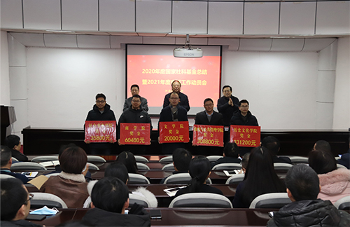 会上,社会科学处处长李永贤就我校2020年度及“十三五”期间国家社科基金的申报与资助情况、纵向横向对比情况、国家社科基金获取的主要经验及不足,以及2021年度国家社科基金任务分解与时间节点安排等进行了全面阐述汇报。文学院院长赵黎波和商学院院长杨玉珍分别代表获得2020年度国家社科基金立项奖励的单位介绍了学院在国家社科基金申报方面采取的具体做法和成功经验。政治与公共管理学院教授孟轲作为国家社科基金重大项目立项代表、历史文化学院副院长张继汝作为国家社科基金后期资助项目立项代表分享了国家社科基金成功申报的经验和体会。马治军宣读了《河南师范大学2020年度国家社科基金获得立项奖励的单位名单》,与会校领导为获奖单位颁奖。