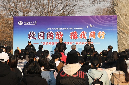12月27日上午,校园防恐,豫我同行——新乡市反恐怖宣传教育进校园活动启动仪式在我校西校区校训石广场举行。新乡市反恐办主任、公安局副局长刘跃江出席仪式并讲话,校党委副书记梅宪宾出席仪式并宣布活动启动。新乡市公安局、教育局、交通运输局、卫生健康委、邮政管理局、商务局、应急管理局、牧野公安分局和我校相关职能部门负责人、师生代表400余人参加了仪式。仪式由新乡市公安局国保支队副支队长陈平主持。