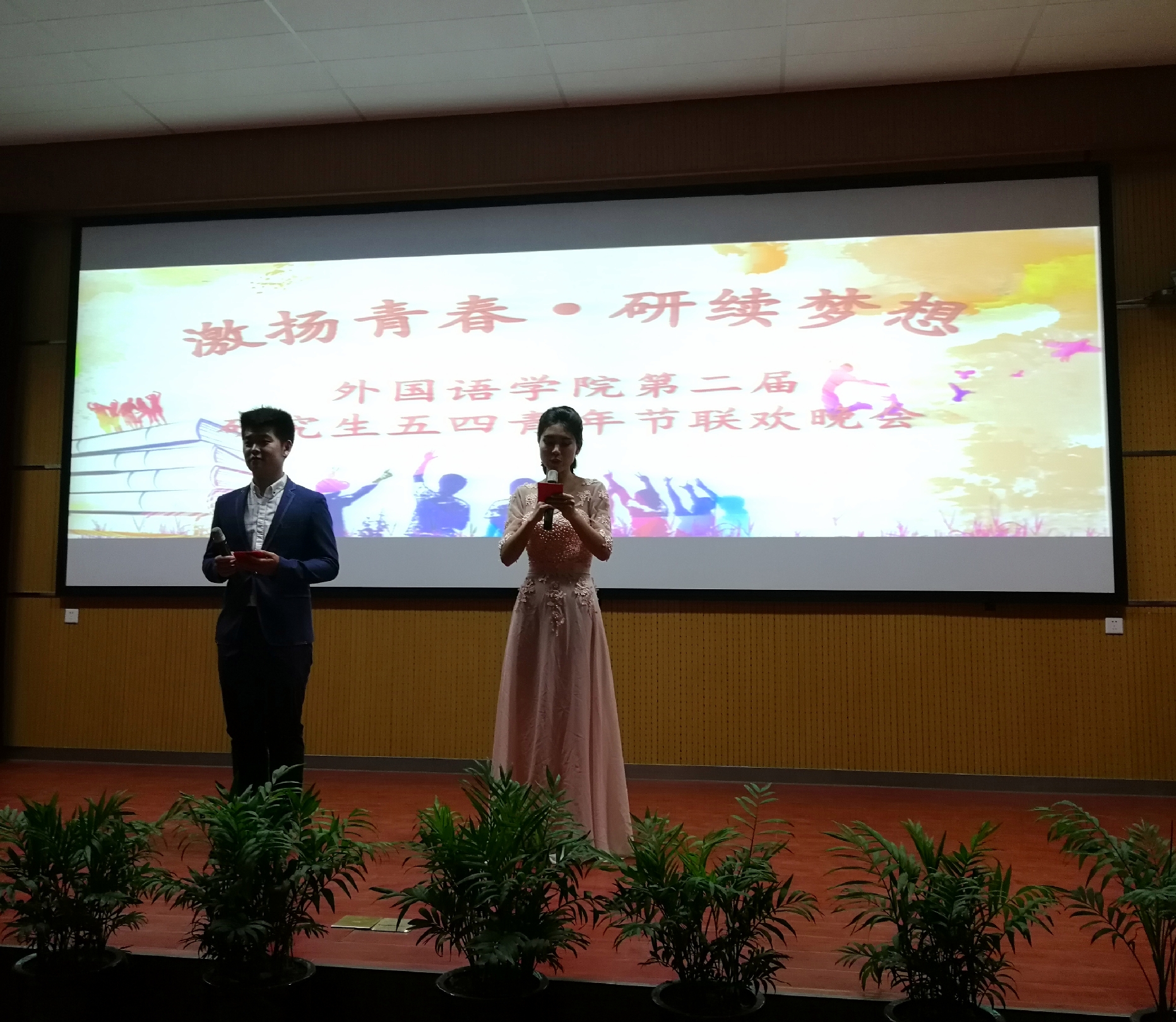 5月4日晚,外国语学院研究生“激扬青春•研续梦想”五四青年晚会在院学术报告厅举行,研究生辅导员刘静观、工作秘书肖俊林、外教Rob Hardy、导师王彩琴教授及百余名研究生参加了晚会。