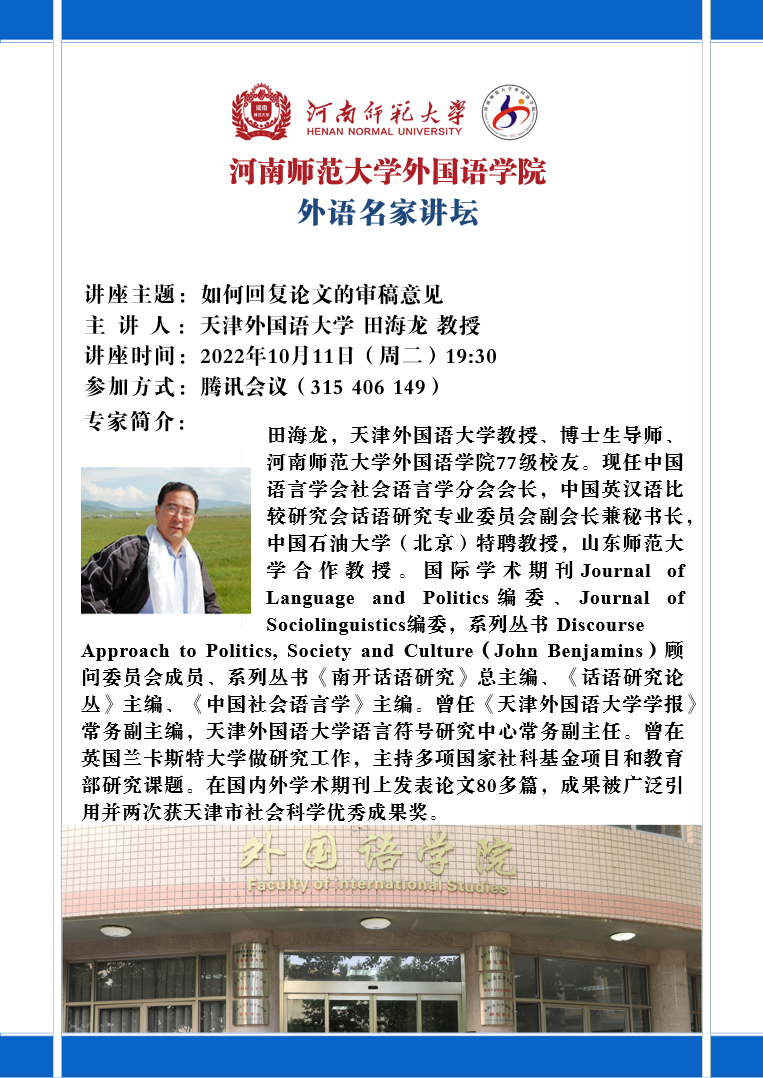 【预告】外语名家讲坛:如何回复论文的审稿意见 天津外国语大学 田海龙 教授