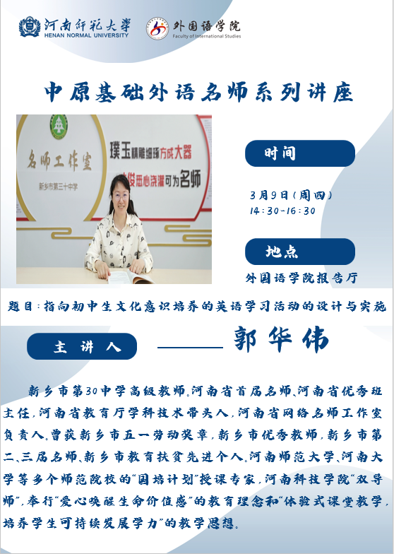 中原基础外语名师系列讲座(预告):指向初中生文化意识培养的英语学习活动的设计与实施—新乡市第30中学郭华伟