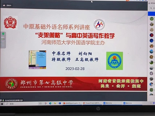 2月28日,应外国语学院邀请,中原名师、河南省名师、河南省教师教育专家、河南省特级教师刘向阳老师通过腾讯会议作了“支架策略与高中英语写作教学”的线上学术讲座。讲座由于浩鹏教授主持,我院部分教师、教育硕士研究生90余人聆听了此次讲座。