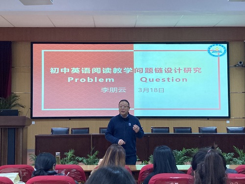 李朋云老师从自身教育工作经历出发,围绕《义务教育英语课程标准》就初中英语教学现状进行了分析。他指出,当前初中英语阅读教学中普遍存在有效性和逻辑性有待提高、语篇分析相对贫乏、模式化、浅层化、碎片化严重等问题,针对上述问题,李老师提出了阅读教学设计中的问题链设计原则,涉及文本分析、学情分析、教学目标及教学过程、教学评价等四个环节。他认为阅读教学中的问题链设计要基于语篇的主题意义,指向语言知识点,聚焦课堂教学目标。此外,他对如何在说明文、记叙文、应用文等不同文体中进行问题链设计逐一进行了解释说明。讲座结束后,李老师与在场师生进行互动交流,并对大家提出的相关问题给予耐心细致的解答,大家纷纷表示此次讲座内容丰富、讲解深入浅出,让大家对问题链设计原则有了更深的理解。