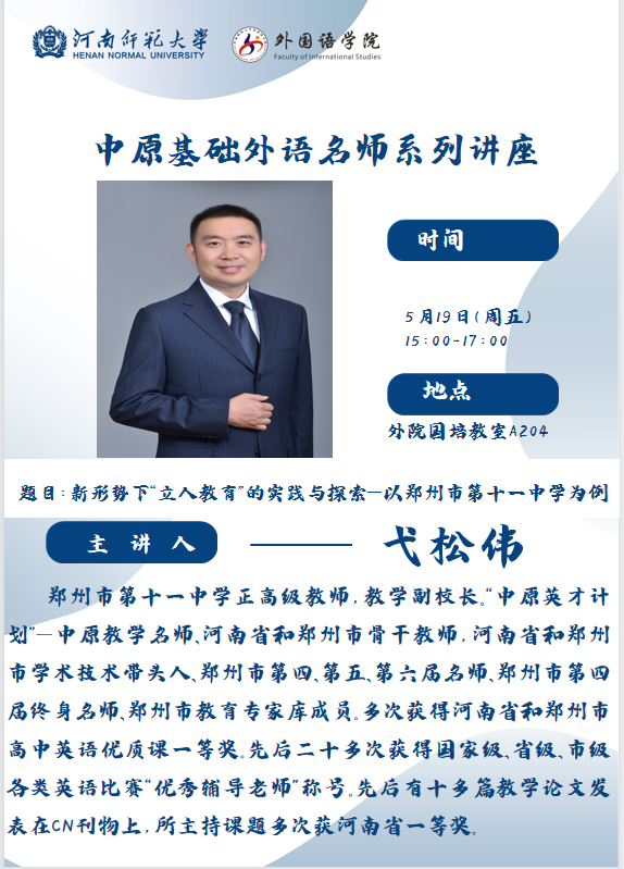 中原基础外语名师系列讲座(预告):新形势下“立人教育”的实践与探索—以郑州市第十一中学为例