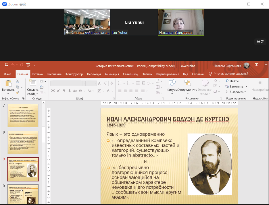 在首场报告中,娜塔丽娅介绍了世界心理语言学的学科起源、理论基础和发展历史。她指出,苏联-俄罗斯心理语言学,即言语活动论,主要研究言语生成与理解、言语交际、交际理论、心理词汇、跨文化交际等。其语言学理论基础来源于谢尔巴的语言学思想,心理学基础则来源于心理学家维果茨基的文化历史发展理论和列昂节夫的系统活动论。该学派将言语作为一种特殊的心理活动和人类社会实践的形式,关注言语在个体心理发展中的作用,以及言语如何作为思维和交流的工具。