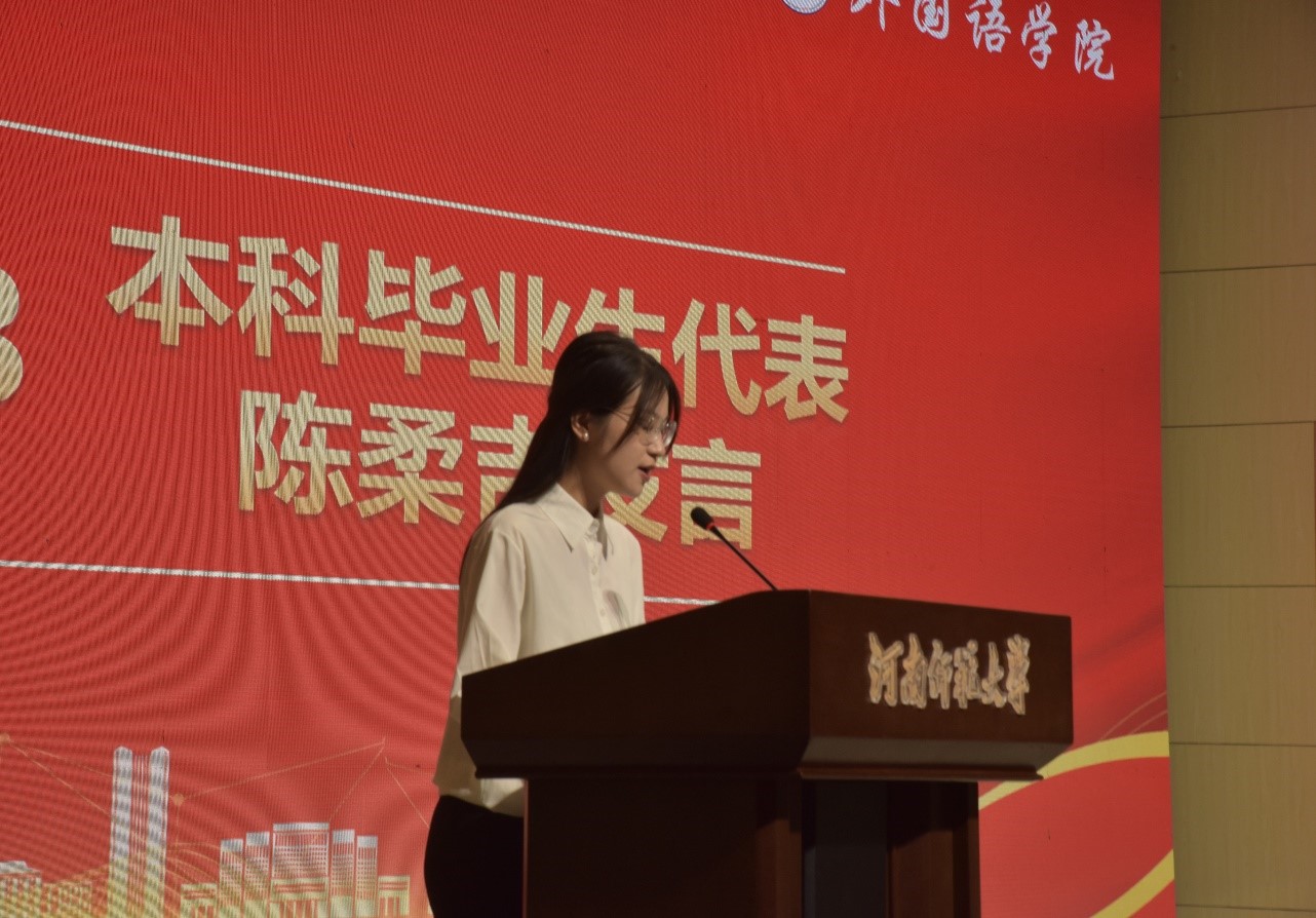 毕业研究生代表张莫晗发言,她认为外国语学院就像一位成熟稳重的智者,具有丰厚的学术底蕴和广博的人文情怀,她表示将牢记母校的嘱托,不断努力奋斗,为母校增光添彩。