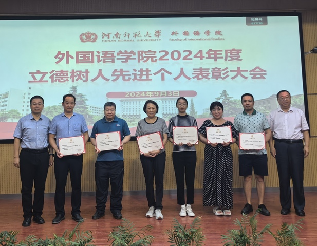 9月3号下午,外国语学院在学院报告厅成功举办2023-2024年度立德树人先进个人表彰大会,此次大会旨在弘扬高尚师德,积极营造尊师重教的良好风尚,表彰在教育教学、科学研究等工作中表现卓越的教师,建设一支“师德高尚、业务精湛”的师资队伍。学院领导班子及全体教职工参加此次表彰大会,会议由学院工会主席曹崇主持。