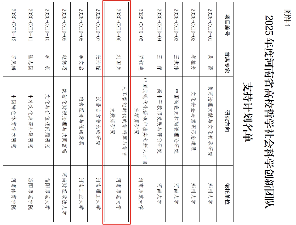 8月31日,中共河南省委教育工委、河南省教育厅公布了《2025年度河南省高等学校哲学社会科学创新团队支持计划的通知》(豫教工委〔2024〕228号),外国语学院院长刘国兵教授作为首席专家申报的“人工智能时代的语料库与语言大数据研究”获得立项资助。