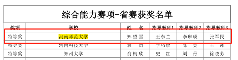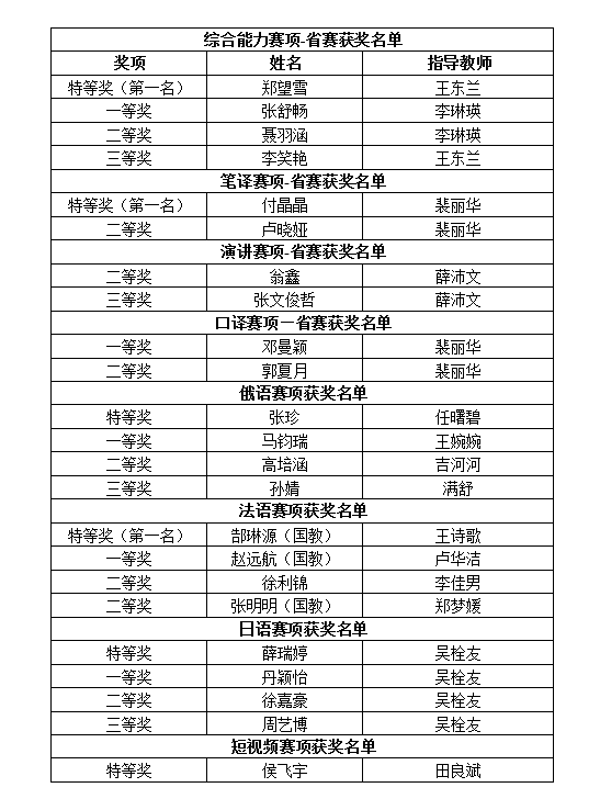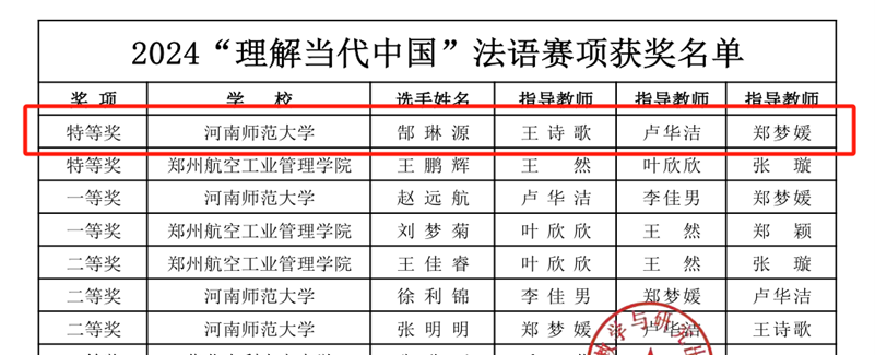 2024年“外研社·国才杯”“理解当代中国”全国大学生外语能力大赛河南赛区比赛由河南省教育厅主办,河南省高等教育学会外语教学研究分会、河南省普通高等学校外国语言文学类专业教学指导委员会、外语教学与研究出版社协办。该项赛事是中国高等教育学会发布的《2024年全国普通高校大学生竞赛分析报告》竞赛目录中上榜的外语类赛事。此次省赛,我校23位学子凭借过硬本领和扎实的语言功底脱颖而出,斩获特等奖6项,一等奖5项,二等奖6项,三等奖4项,其中郑望雪、付晶晶、郜琳源三位同学分别获得综合能力赛项、笔译赛项、法语赛项的特等奖第一名,获得特等奖的6位同学将代表河南省参加全国总决赛。