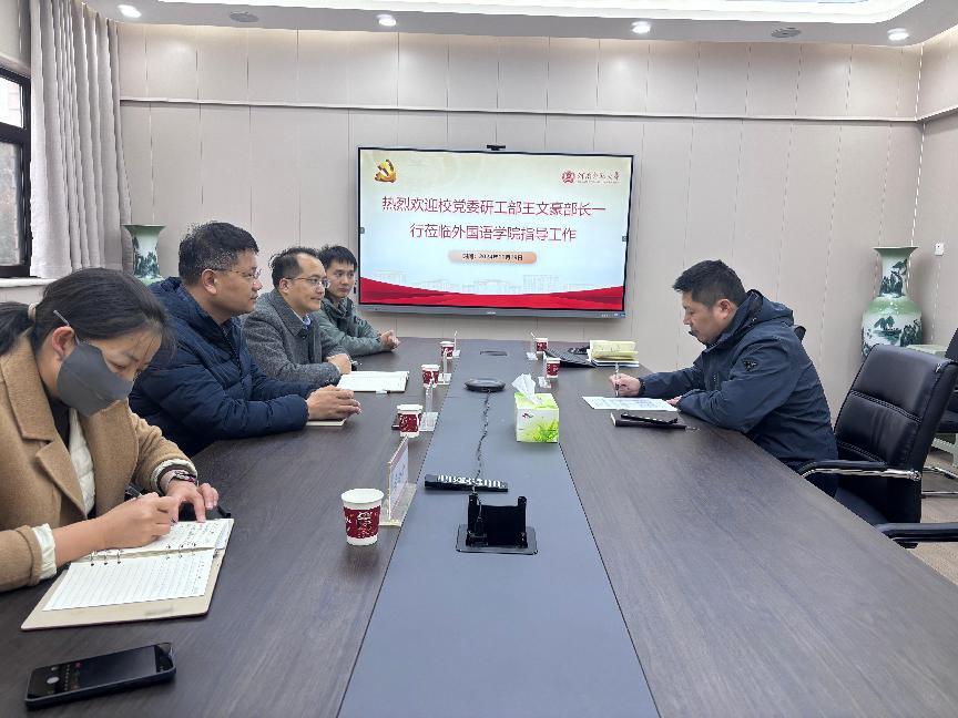 外国语学院党委副书记曹崇对王文豪一行的到来表示热烈欢迎,并简要介绍了学院近期研究生学生工作的情况。随后,与会人员围绕辅导员队伍建设、学生日常管理、研究生导师与辅导员如何形成合力和研究生科研与学生活动等多个议题展开了深入讨论。
