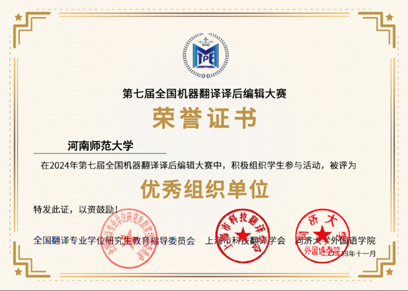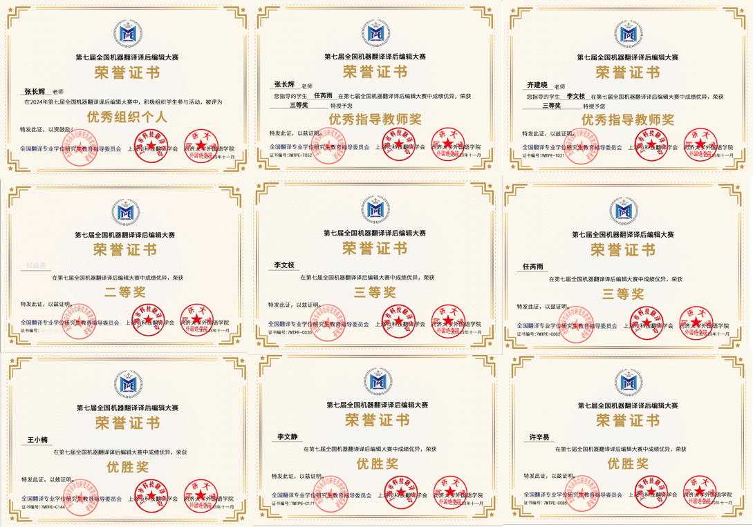 12月1日,由全国翻译专业学位研究生教育指导委员会、上海市科技翻译学会和同济大学外国语学院联合主办的第七届全国机器翻译译后编辑大赛圆满结束。我院英语笔译研究生付晶晶荣获二等奖,李文枝和任芮雨荣获三等奖,许辛易、王小楠和李文静荣获优胜奖,指导教师娄宝翠、张长辉、齐建晓和刘霞分别荣获“优秀组织个人”“优秀指导教师”等称号,河南师范大学被评为“优秀组织单位”。