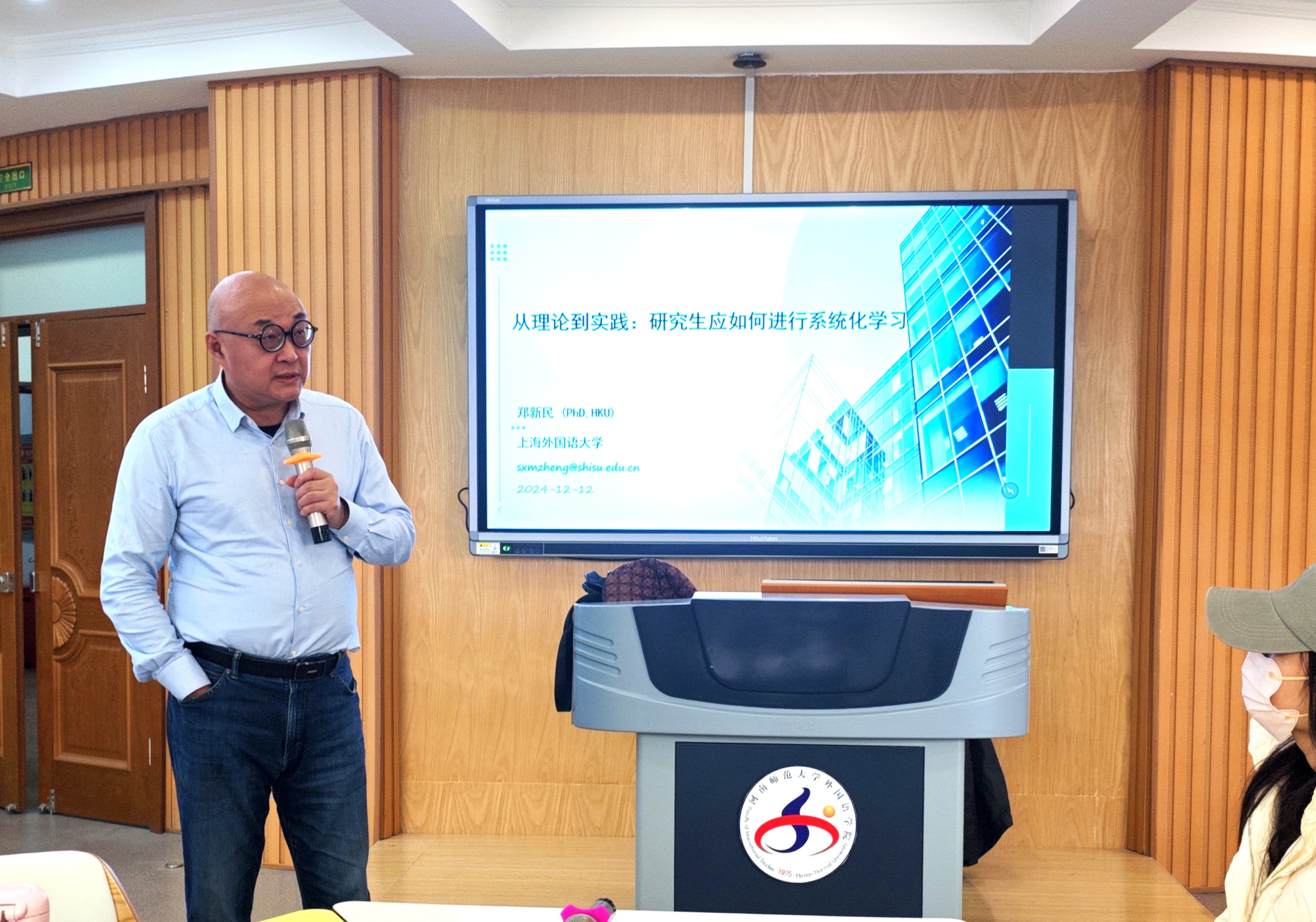 12月12日,应外国语学院邀请,上海外国语大学郑新民教授在学院A301室作了“从理论到实践:教育硕士如何去学习碎片化”的学术报告,学院近百名师生参会聆听。外国语学院肖俊林老师主持报告。